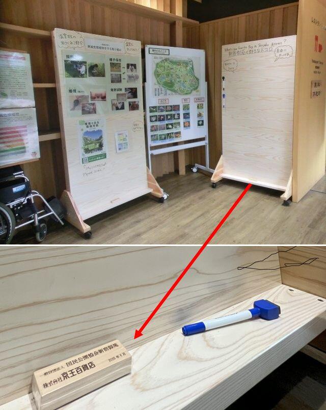 今回の寄付は、新宿御苑の維持管理業務を実施している一般財団法人国民公園協会に対し行いました。当社の寄付をもとに設置されたのは、木製ホワイトボード「きえすぎくん」です。多摩産の管理された木材を使用し都内の会社が製作した地産地消のボードは、2025年6月末に苑内のサービスセンター等に設置され、季節ごとの見どころの案内や来園者のメッセージの寄せ書き等に使われています。