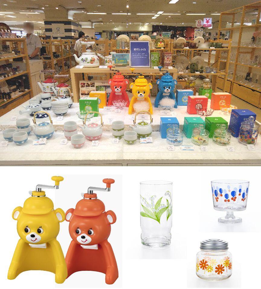 昭和100年を記念して、同売場では、昭和にちなんだ食器・調理用品を売場前面に集積展開しました。写真中央のかわいらしい「かき氷器」は、1978年にタイガー魔法瓶が発売した「きょろちゃん」の復刻商品。氷を削るハンドルの回転に合わせて、お目目がきょろきょろと動く愛らしいアイテムです。可愛らしいレトロ柄が目をひくガラス食器メーカー「アデリアレトロ」の商品はレトロな色使いと花や動物などの柄が特徴的でプレゼントとしても人気。その他にも、2010年にグッドデザイン賞を受賞し、肥前吉田焼の代名詞ともいえるドット柄の茶器、1947年創業の国内最大級のホーロー製造メーカー、富士ホーローの名作「フル―タスコレクションⅡ」シリーズなど、昭和レトロを感じるデザインの品々を取りそろえました。
