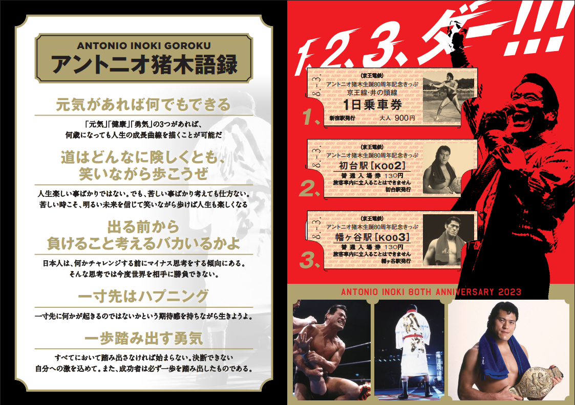 「燃える闘魂・アントニオ猪木展」を京王グループ全体で盛り上げるため京王電鉄(株)の鉄道部門へアプローチ。アイデア出しの末、「アントニオ猪木生誕80周年記念きっぷ」をイベント会期に合わせて数量限定で販売することになりました。 猪木さんのイメージカラーである赤を基調とした往年のファイトシーンの写真や“アントニオ猪木語録”がデザインされた台紙に、「1、2、3、ダー!」の掛け声にちなんで3枚のD型硬券がセットになった超限定品は、京王百貨店のイベント会場であるB1階 on the Cornerおよび京王線新宿駅 京王西口 駅窓口にて8月3日(木)より販売され、当日中に完売するほどの人気でした。 ※京王百貨店 新宿店 B1階 on the Cornerでも限定数の一部を販売し、8月5日(土)に完売しました。