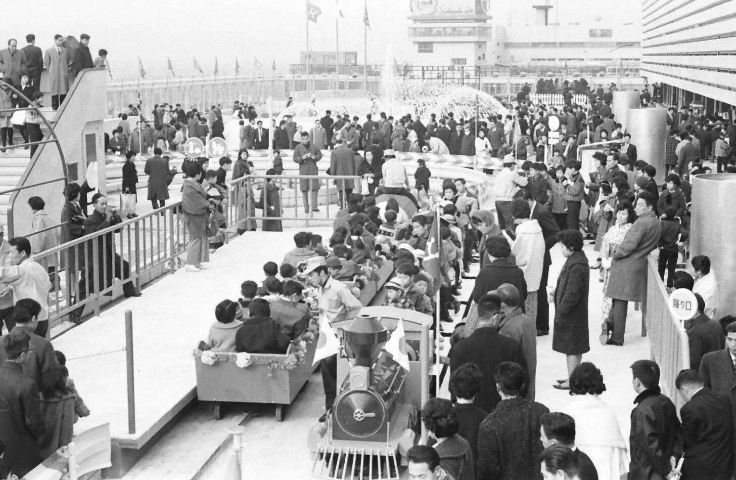 1964年11月に京王百貨店 新宿店が開店。その2カ月後の1965年1月に屋上が開業しました。ゴーカートや全長170Mの線路を走る豆汽車や、猿・鳥小舎、噴水などがあり、屋上の約9割が遊具施設でした。そのほか、園芸用品や観賞魚も販売していました。その年の夏にはビアガーデンも開業しました。