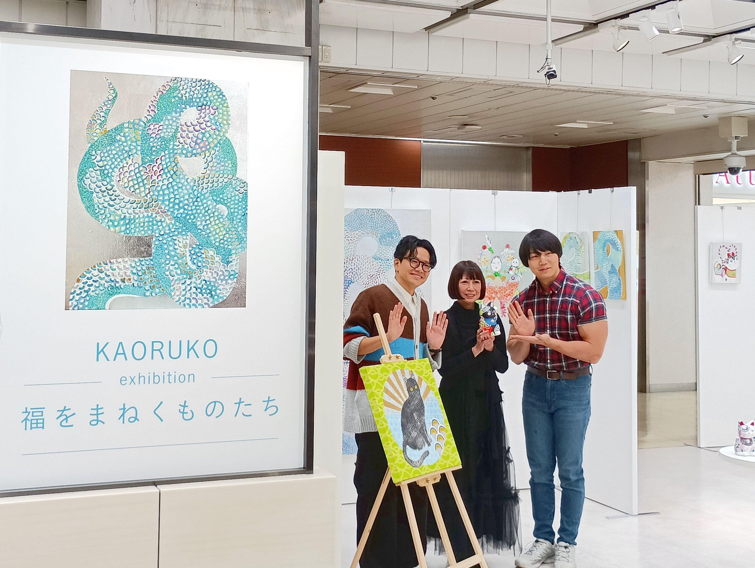 1980年代にアイドル「新井薫子」として活躍され、その後現代アーティストに転身、NYでも活動されているKAORUKOさんの個展を初開催。テーマは「福をまねくものたち」として龍や狛犬、招き猫などを現代アートで表現。日本に古くからある伝統、文化の素晴らしさを感じさせる作品の数々が並びました。1階正面入口付近での展開ということもあり、若年層の方や50~60代の女性の方を中心に幅広い世代のお客様にご来店いただき、縁起ものとして自宅に飾りたい、作品ができるまでのストーリーに感動・共感した、と手に取ってくださる方が多くいらっしゃいました。