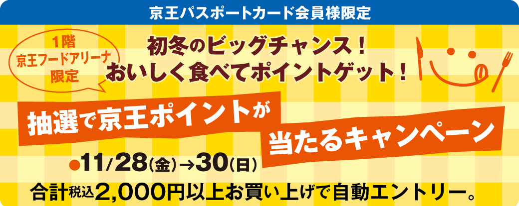 期間中、京王百貨店 聖蹟桜ヶ丘店 1階京王フードアリーナで、京王パスポートカードをご利用の上、お買い上げ金額合計税込2,000円以上で、後日、抽選で京王ポイントをプレゼントいたします。