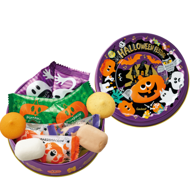 おばけやかぼちゃが描かれたハロウィンデザイン缶に、プチクッキーとマシュマロを詰め合わせました。
