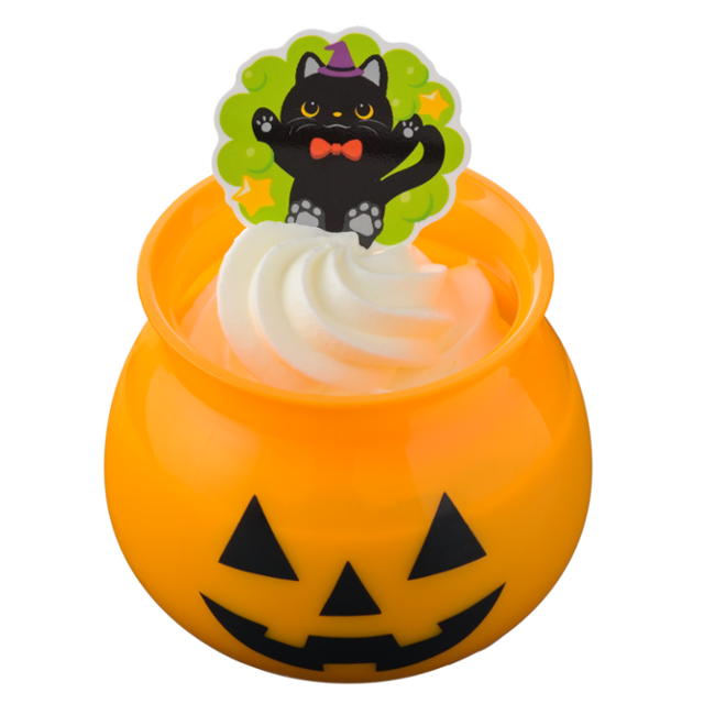 ハロウィンのジャック・オ・ランタンのカップに入ったパンプキンプリン。甘みとコクが口の中でまろやかに広がります。