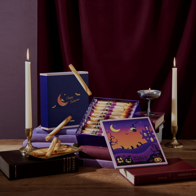 長年愛されるヨックモックのシガールをハロウィンらしさ広がる華やかな限定缶に詰めました。