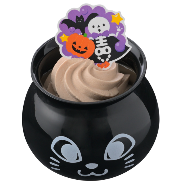 ハロウィンの黒猫のカップに入ったチョコプリン。ミルクチョコの優しい甘さと乳味が心地いいなめらか食感のプリンです。