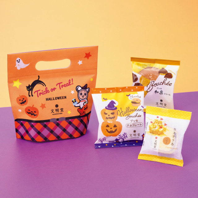 ハロウィン限定のキュートなバッグに、自慢の菓子3種を詰め合わせました。