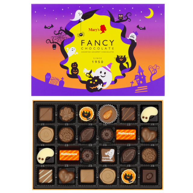 ハロウィンデザインの箱を開けると、にぎやかに並ぶチョコレートが登場!ハロウィンパーティーにおすすめです。