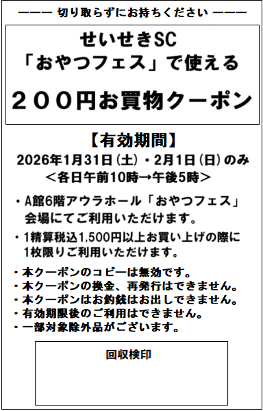 1/24(土)→30(金)の期間中、京王百貨店 聖蹟桜ヶ丘店 1階 京王フードアリーナ[諸国銘店]・[ヨックモック]でお買い上げいただくと、1/31(土)・2/1(日)にA館6階「おやつフェス」にて1精算税込1,500円以上お買い上げの際に1枚ご利用いただけるレシートクーポン(200円お買物クーポン)が発行されます。