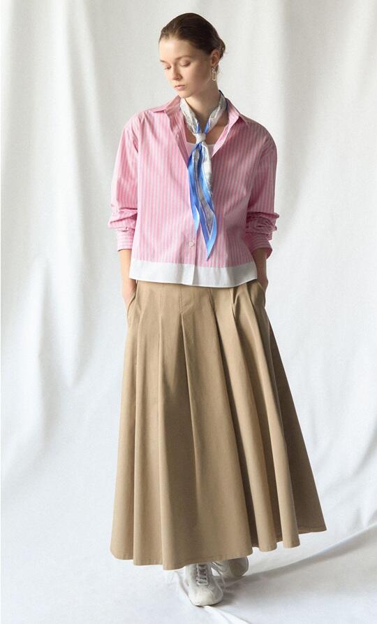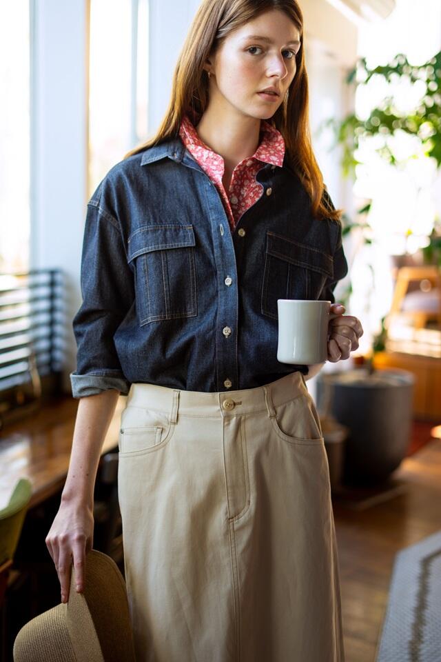23区定番アイテムのカンクリーニシャツに、動きのあるチノスカートを合わせた春コーデ。スカーフを添えたやさしい着こなしが、大人のかわいらしさを引き立てます。