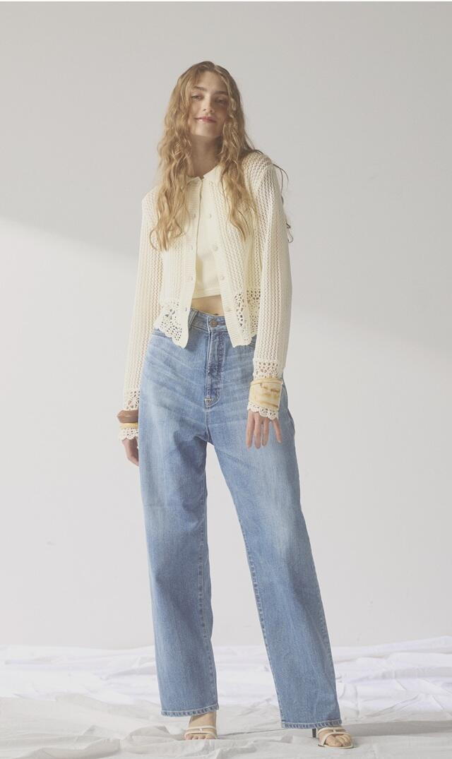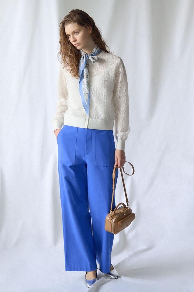 繊細なラッセルレースニットに、鮮やかなブルーパンツを合わせた春らしいコーディネート。清涼感のあるカラーが映え、上品さの中に程よい華やかさを添えます。