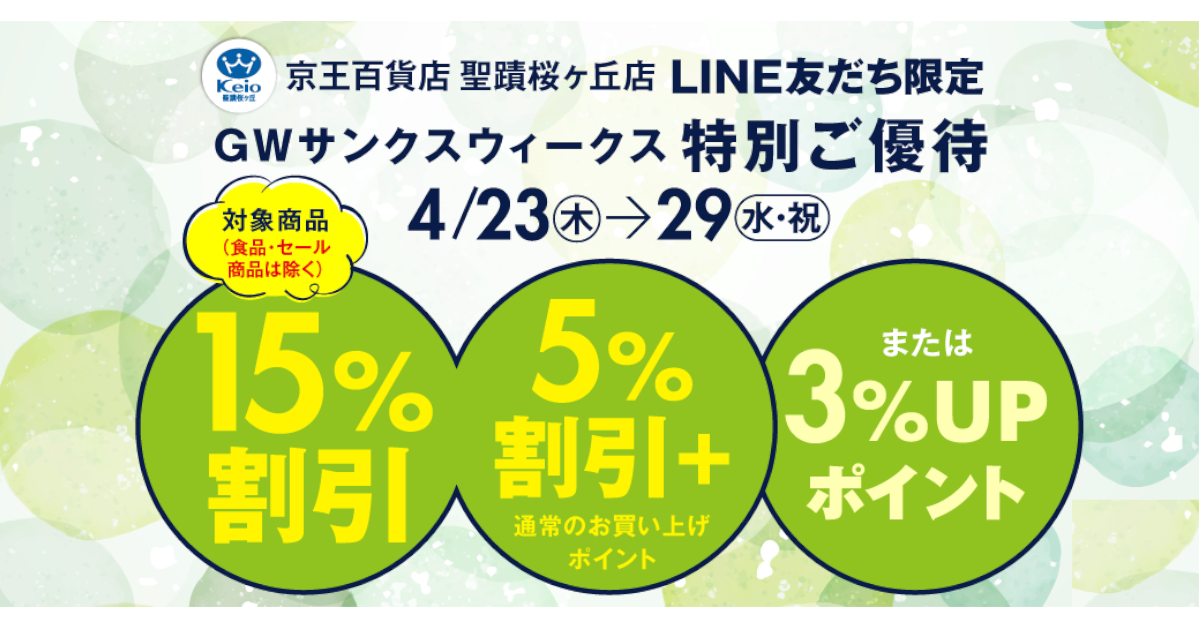 期間中、聖蹟桜ヶ丘店LINE公式アカウントに友だち登録の方に限り、京王パスポートカードをご利用のうえ、対象商品をお買い上げいただくと、特別ご優待をいたします。
