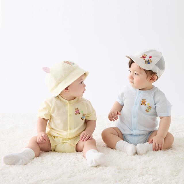 見た目も涼しく優しい色味のベビーアイテム。 バックロゴと胸元の刺しゅうがポイント。