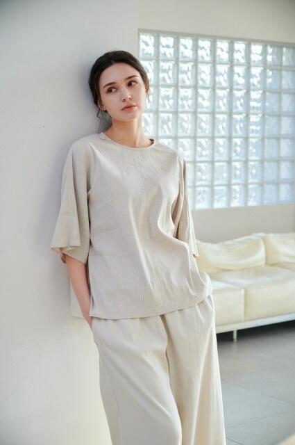 ストレッチリネンフレアスリーブブラウス(麻58%・レーヨン39%・ポリウレタン3%)
