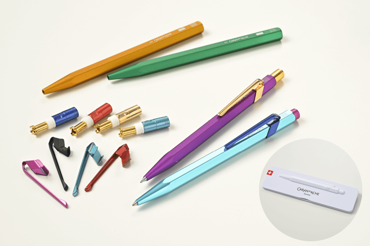 ボディ、ノックボタン、クリップ、カートリッジを自由にチョイスできるボールペン「カランダッシュ+Me」。カラーリングでアイデンティティを表現したり、大切な人をイメージしたカラーを組み合わせたり。お気に入りの1本を作ってみませんか?ご希望でお名入れも承ります。