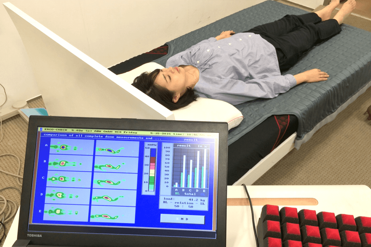 体圧測定器「エルゴチェック」を使用し、寝ている時の身体への圧力を測定。結果に基づき、お客様に合ったマットレスのタイプや硬さをご提案いたします。