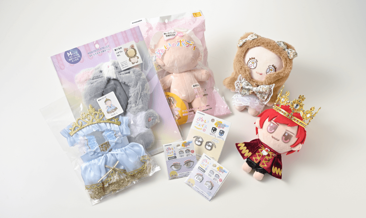 組み合わせるだけで簡単に自分の“推し”が作れちゃう!素体から目や口のワッペン、カットクロスまで豊富に取り揃えました。ぬいにぴったりの被り物やお洋服、メガネや靴などの小物も充実していますので、ぜひ、一度ご来店ください。