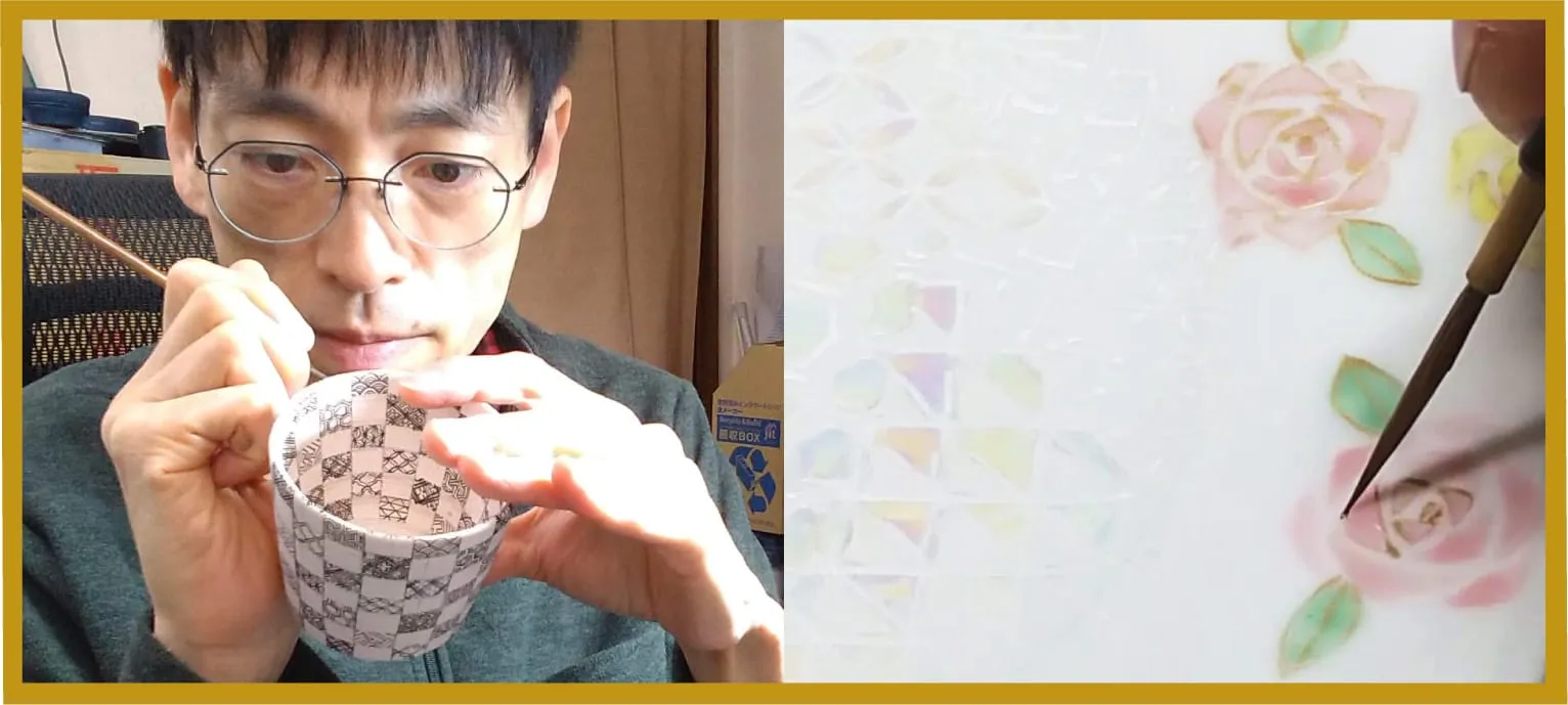 When encountering “Komon”- simple repeating pattern designs- at a specialty school in Tajimi City (Gifu Prefecture), he was captivated by their intricate beauty and resolved to master ceramic painting. Each stroke is freehand, creating delicate and gentle works.
