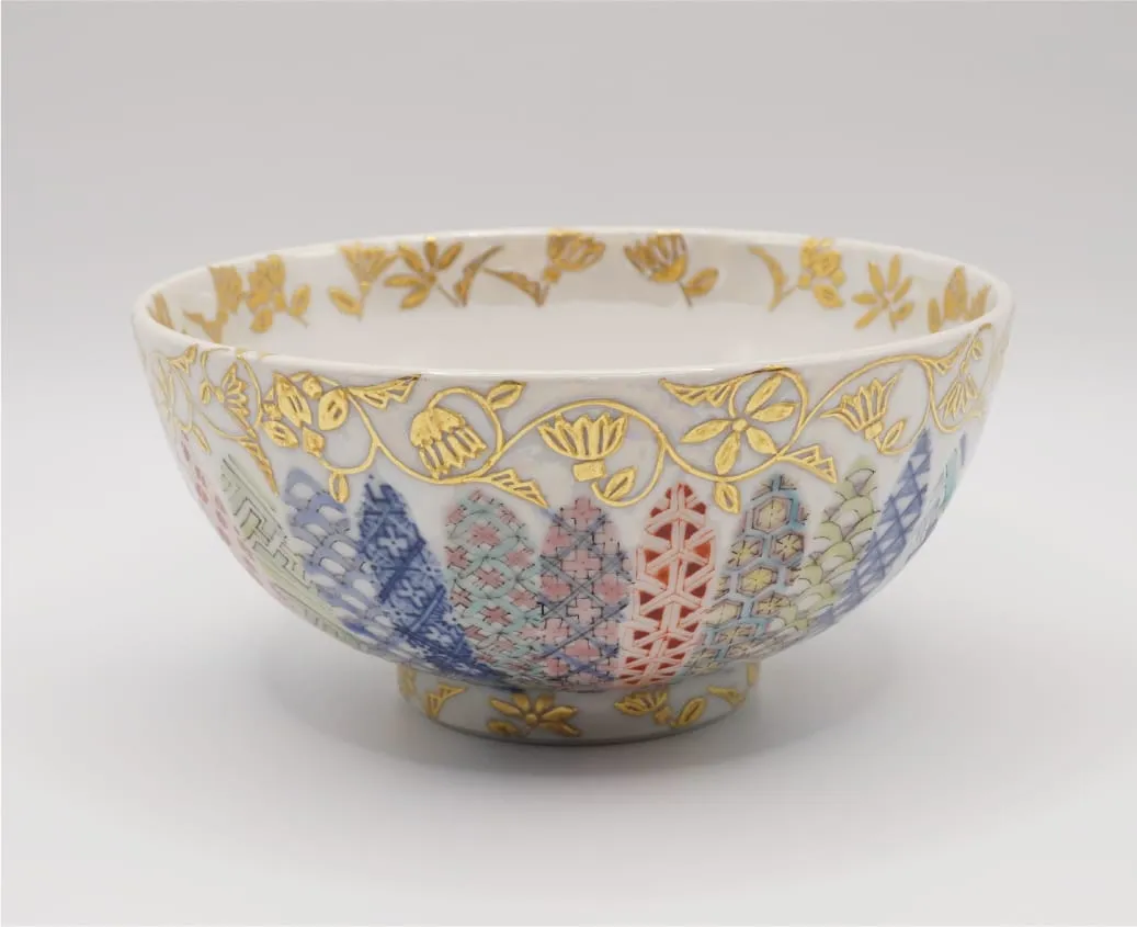 A bowl made on a potter's wheel, featuring a small pattern in underglaze blue and overglaze enamel, along with gold floral scrollwork, all drawn freehand. A splendid piece, as if the bowl were dressed in a kimono.