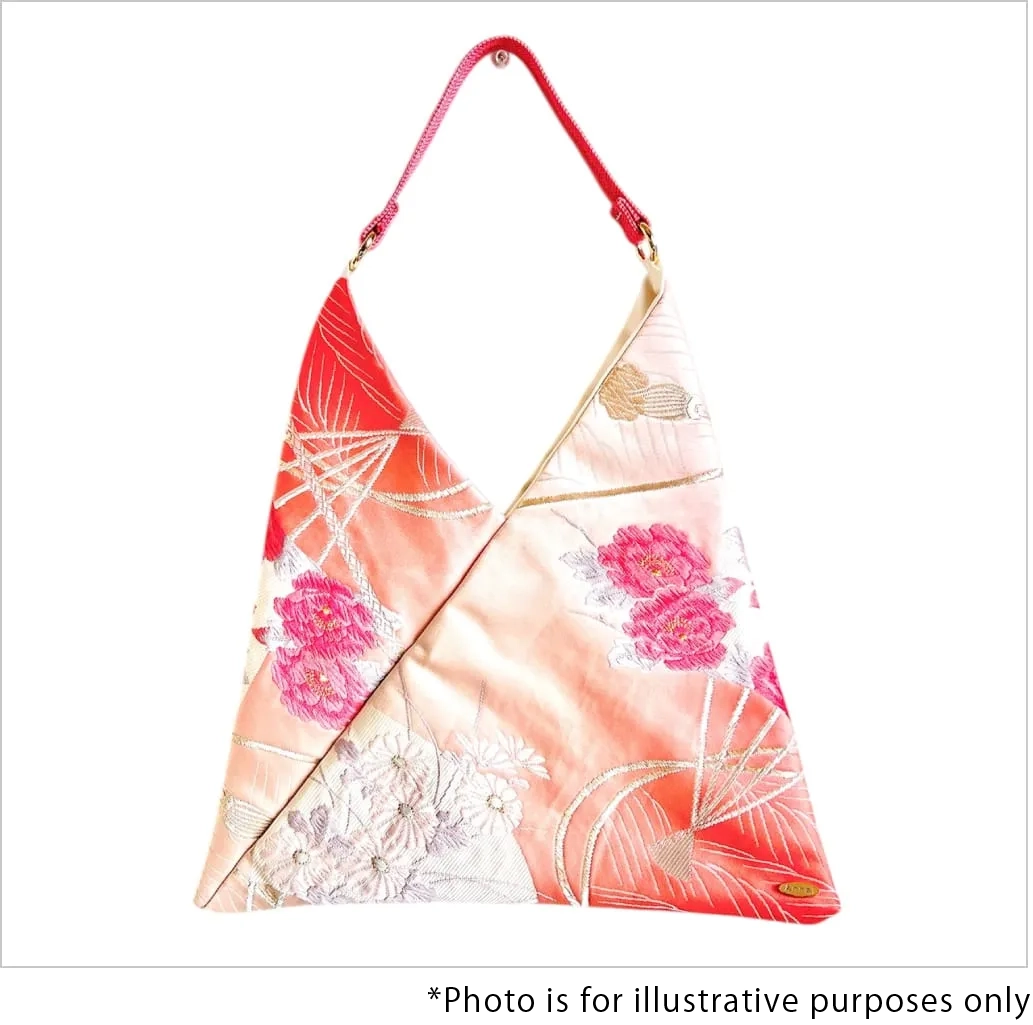 The belt and handles are remade from “obijime” - a decorative string used to hold kimono sash in place. This one-of-a-kind bag features a design inspired by Japanese azuma pouches. Its unique colors and patterns are its defining charm.