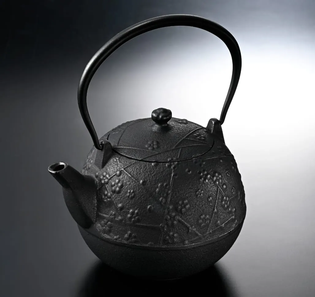 A kettle with a charming melon-shaped form, adorned with plum blossoms in an antique style. The handle can be folded down to store compactly.