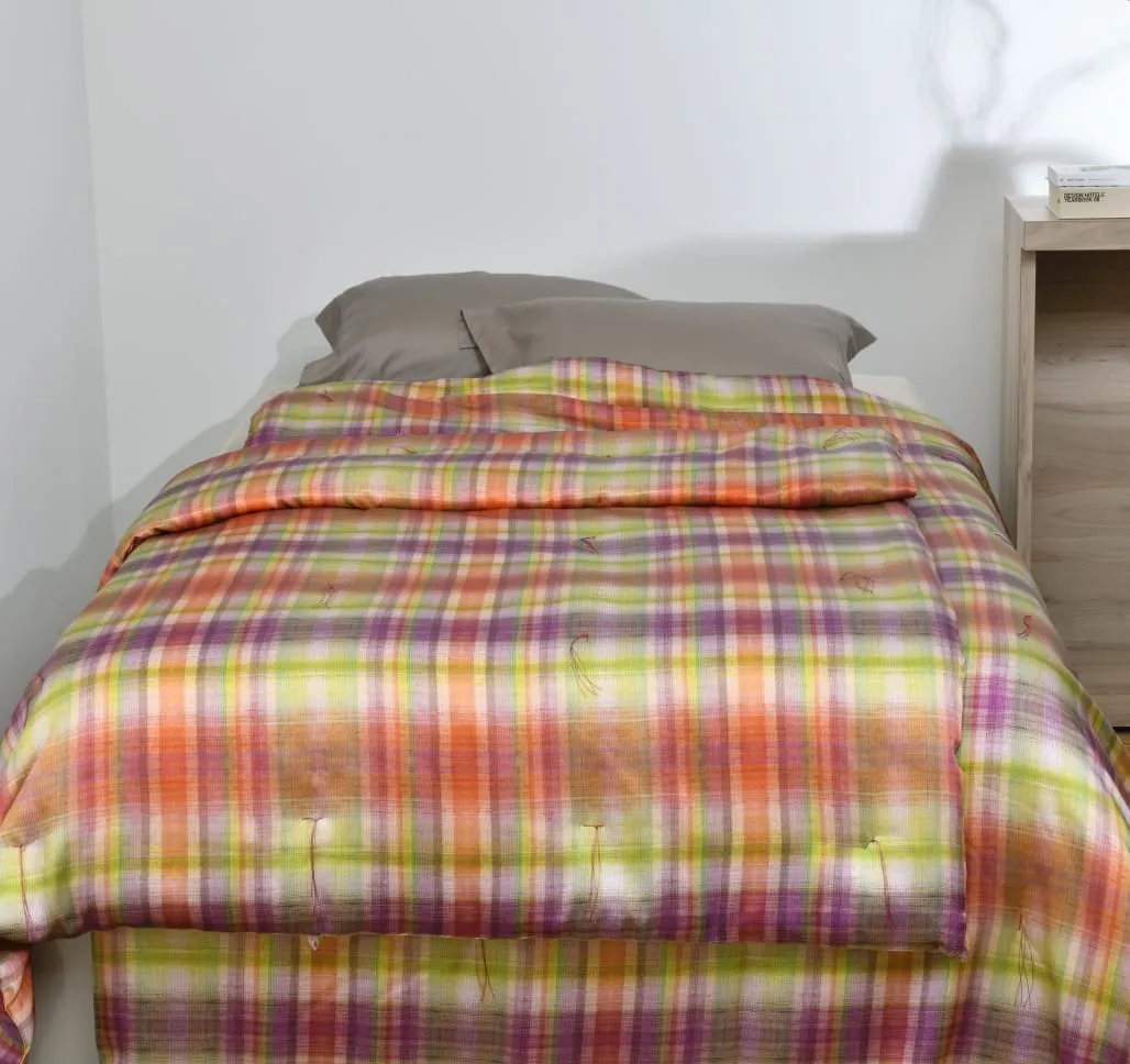 A true silk comforter made by artisans, carefully hand-pulling silk hundreds of times using cocoons cultivated in Omi region (Shiga Prefecture). Outer fabric designed and supervised by Atelier Shimura, based on Shimura Fukumi's plant-dyed and handwoven fabric.