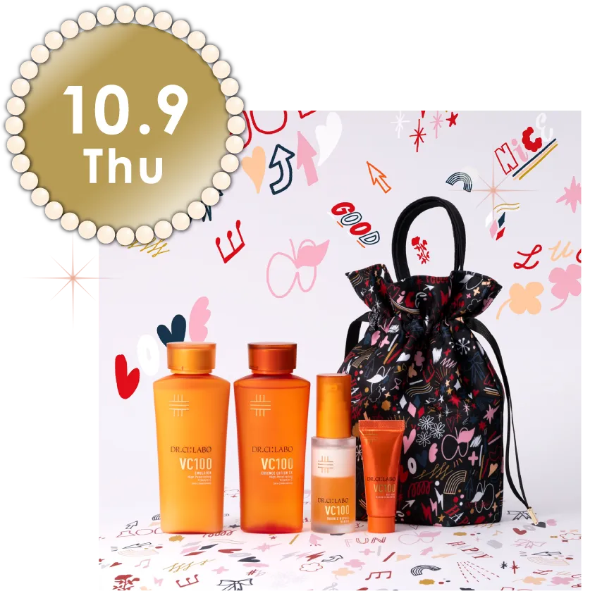 うるおいに満ちたツヤ肌を叶えるビタミンC配合の大人気化粧水と乳液、美容液の現品セットに、ミニサイズのグレンジングをプラス。