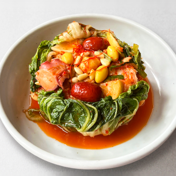 野菜や果物、海の幸などたっぷりの具材を包み込んだ贅沢なキムチは、韓国の王朝で食べられていたことから、宮廷キムチとも呼ばれています。