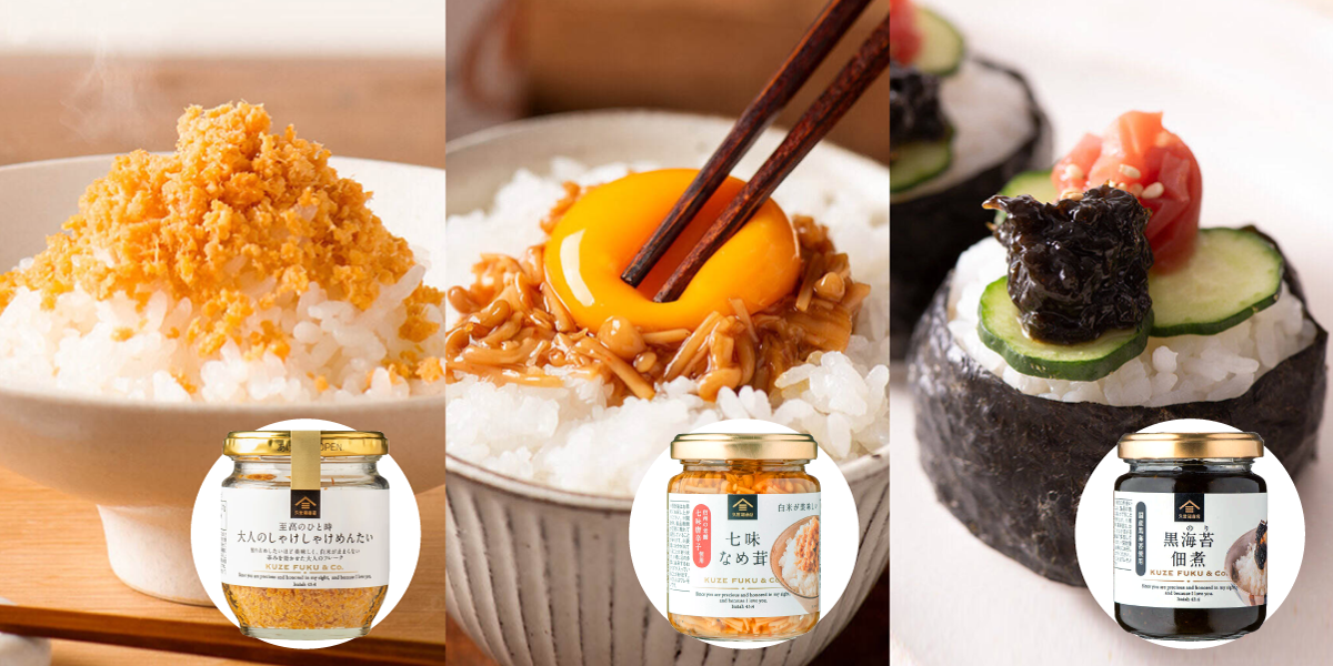 ご飯にぴったりな辛みを効かせたしゃけフレークに、長野県産のえのき茸を使用した七味唐辛子入りなめ茸。佃煮は厳選された国産黒海苔を使用しました。