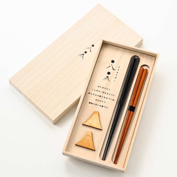 若狭塗の産地、福井県小浜の漆塗り職人がスタートした[兵左衛門]。箸先部分には、合成化学塗料の一切入っていない漆を使用しています。事が丸く収まるようにと頭を丸く、末広がりを願い持ち手からお箸の先まで八角に。縁起の良い富士山のお箸置きとセットにしました。