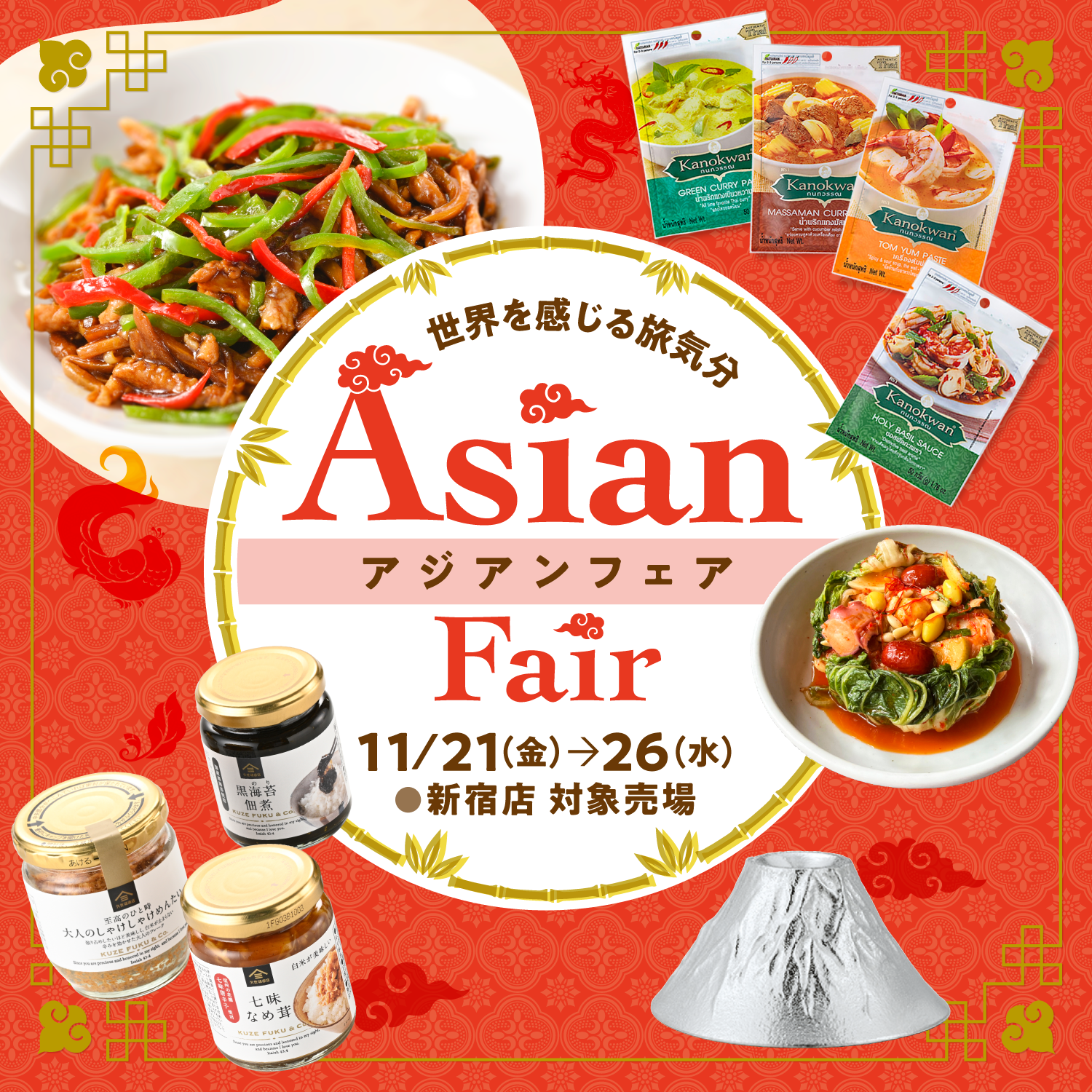 麻婆豆腐やタイカレー、キムチ、ご飯のお供など アジア各国の定番の味をご自宅で手軽にお楽しみください。 また、職人技が光る日本らしい富士山モチーフの工芸品もご紹介!
