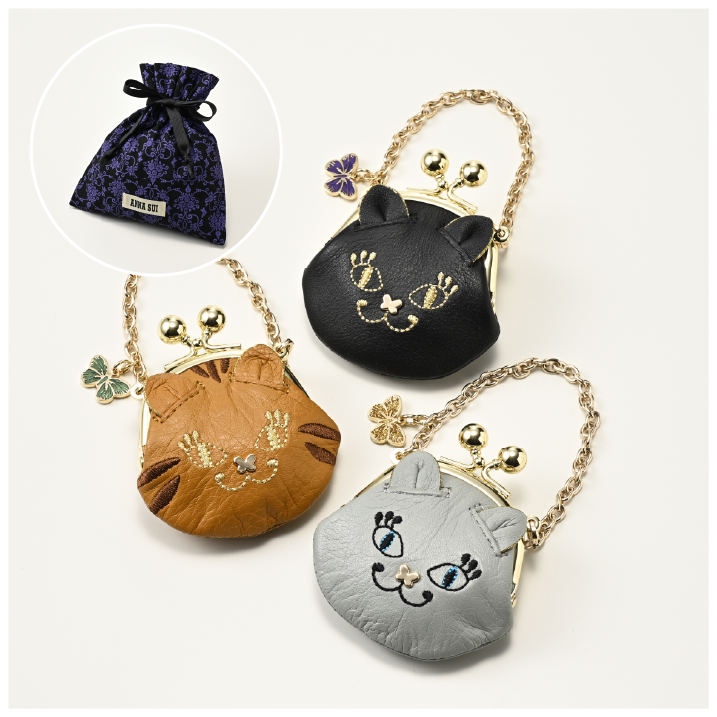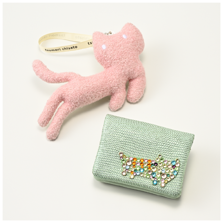 ネコ形のバッグチャームはピンク、ブラック、グリーン、ブラウンの4色を販売。パスケースはネコモチーフをキラキラの輝きで彩りました。