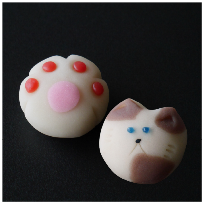 白こし餡を赤く染め、練切で包んだ「パンチだニャン」。「ブチだニャン」は、黒小倉餡を練切で包み愛らしい猫に見立てました。