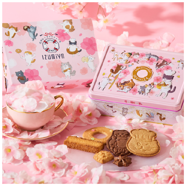 ネコをかたどったクッキーやチーズ風味のチロルクッキーなどのアソート。2月22日(猫の日)にちなみ、期間限定で缶のデザインや包装紙をピンクにチェンジ!