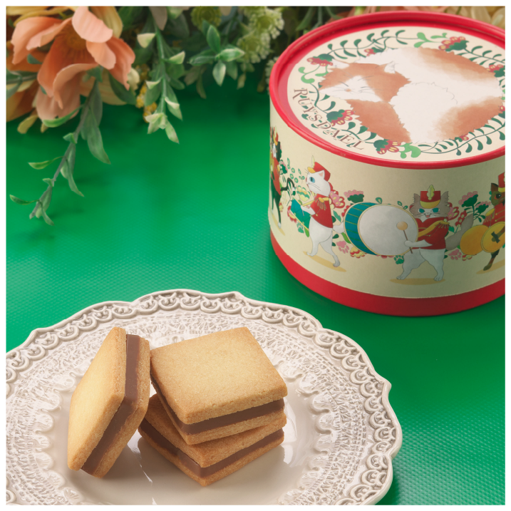 厚焼きのバタークッキーにオリジナルブレンドのミルクチョコレートをサンドしたクッキーサンドを、可愛らしい猫デザインの箱に詰め合わせました。