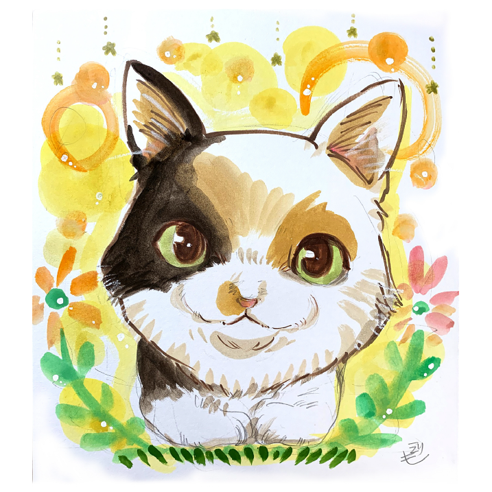 お客様がお持ちになった猫のお写真をもとに、色紙に似顔絵を描きます。
