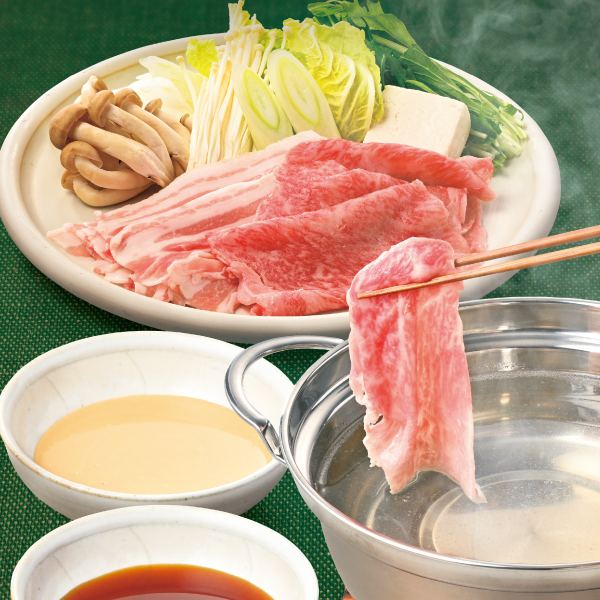 佐賀牛と若楠ポークのしゃぶしゃぶセット (牛ロース〈75g〉・豚バラ〈80g〉・鍋野菜〈白菜・水菜・シメジ・豆腐・白ネギ・えのき〉・ポン酢・ごまだれ・ごはん付、1人前)