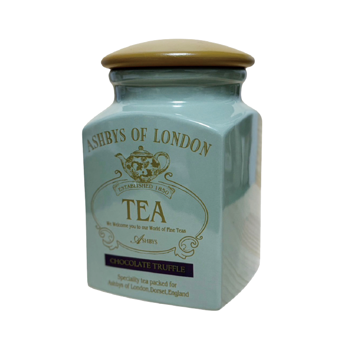 陶器製のティーキャディ入りトリュフチョコレート風味の紅茶。
