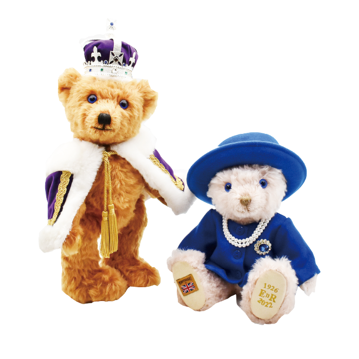 エリザベス女王 チャールズ国王 戴冠記念ベアセット(モヘヤ・王冠:鉄/女王:30cm、国王:35cm)