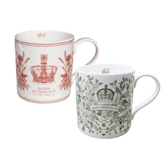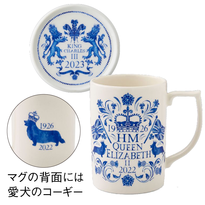 エリザベス女王追悼マグ&チャールズ3世戴冠記念コースターセット(陶器/マグ:340ml・コースター直径11cm)