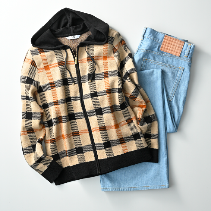 独特な風合いが特徴のイタリア糸で編んだハウスチェックのフードパーカーです。カジュアル過ぎず、きれいめなスタイリングに仕上がります。