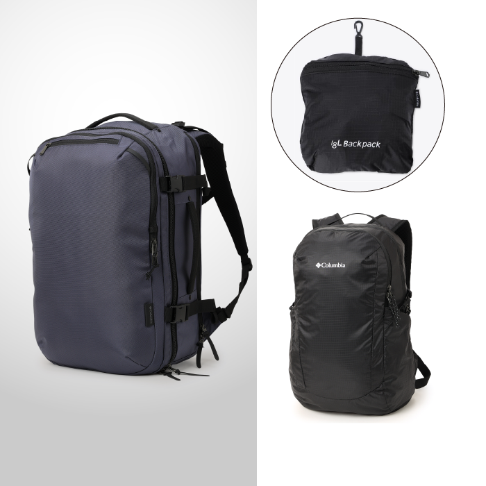 (右)パッカブルバックパック(40×27×16cm、18L)