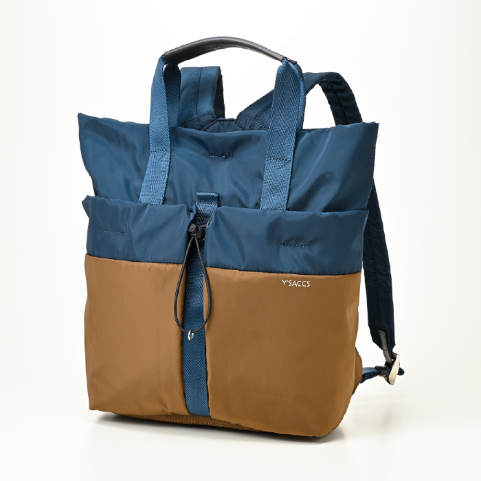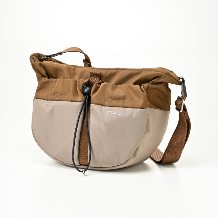 ドローストリングを使用したスポーティーなイメージの軽量バッグ。ツヤ感があり手触りがよいポリエステル素材に、バイカラーの組み合わせがコロンとしたデザインをより引き立てています。
