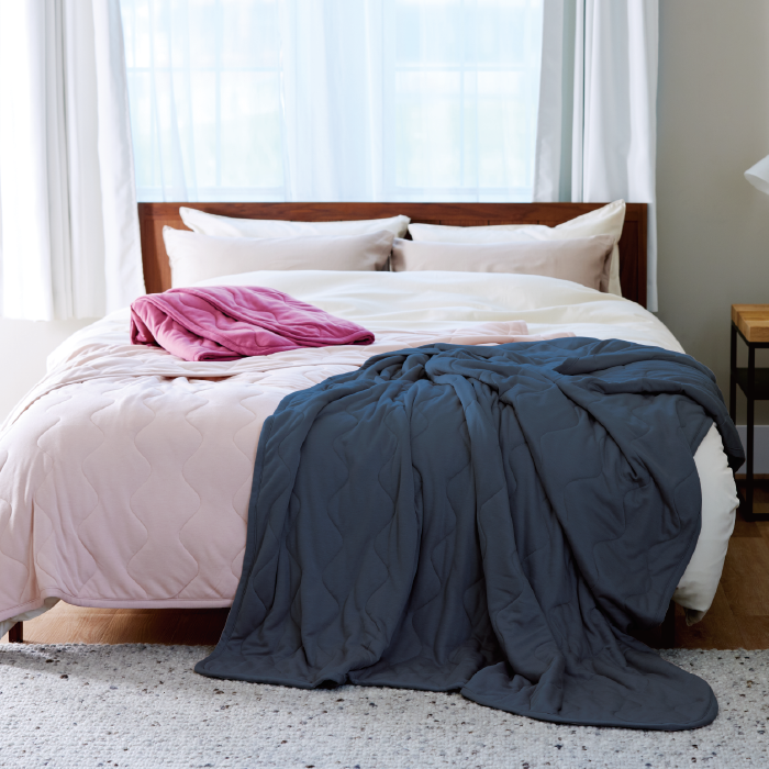 とろけるような優しい肌ざわりのニット素材と吸湿発熱わたを使用。インナーケットは羽毛ふとんの内側に使うとズレにくく、あたたかくおやすみいただけます。リビングケットは膝や肩に掛けて寛ぎのひとときに。