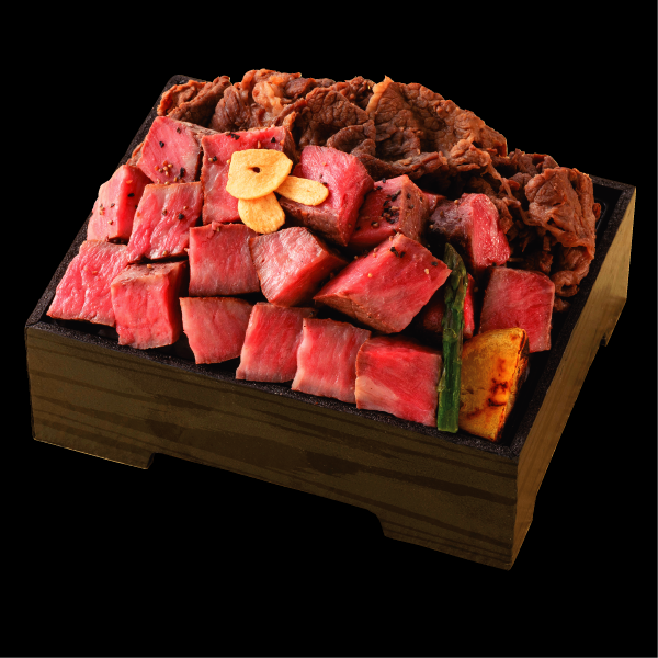 赤身本来の力強い旨みを楽しめるサロマ黒牛モモステーキと、甘みとコクが際立つサロマ和牛すき焼を一折に。