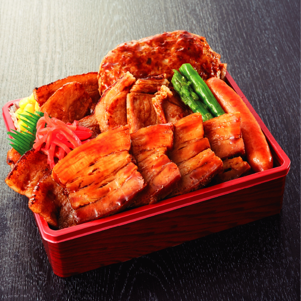 網焼き厚切りかみこみ豚ロース・ハンバーグ・トロトロ角煮のてんこ盛り豚丼 (1折)
