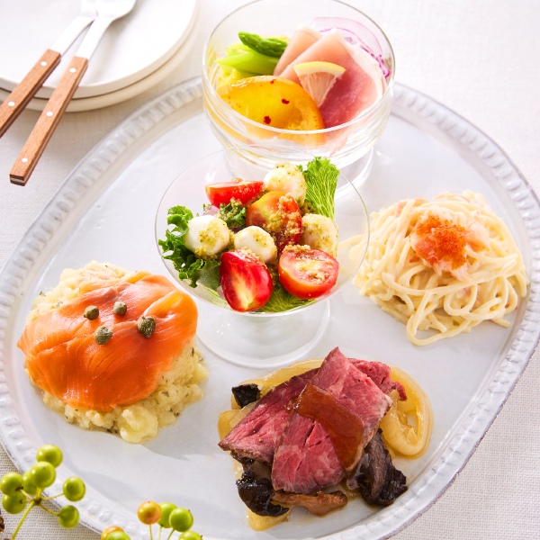 RF1で人気のローストビーフやサーモントラウトを使ったサラダを詰め合わせました。 パーティーにぴったりで、お酒と一緒に楽しめます。