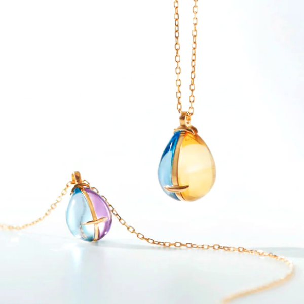2色の石がひとつになって、お互いの輝きを引き立てあう“Day and Night Shizuku”。胸もとで揺れるたびに輝きが変化する、表情豊かなジュエリーです。