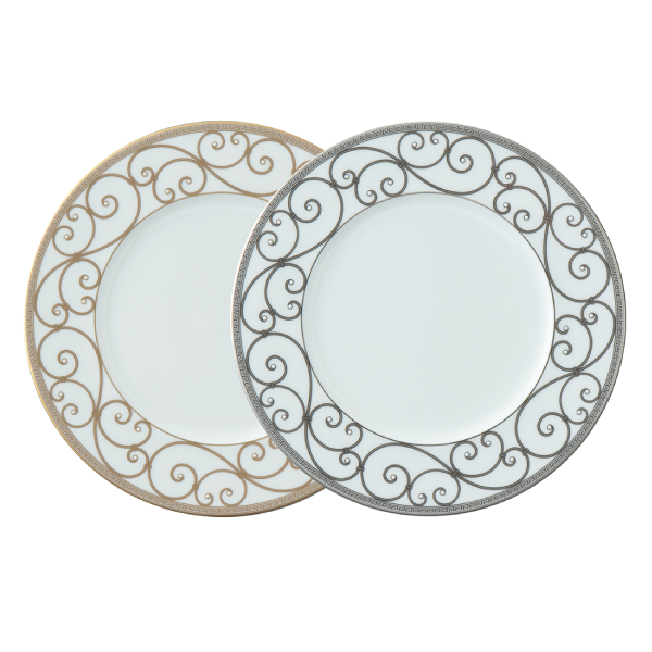 ロンドの旋律の流れを思わせる唐草の美しい曲線と、ニュートラルでエレガントなカラーリングが調和したプレートセット。優雅なティータイムを演出します。