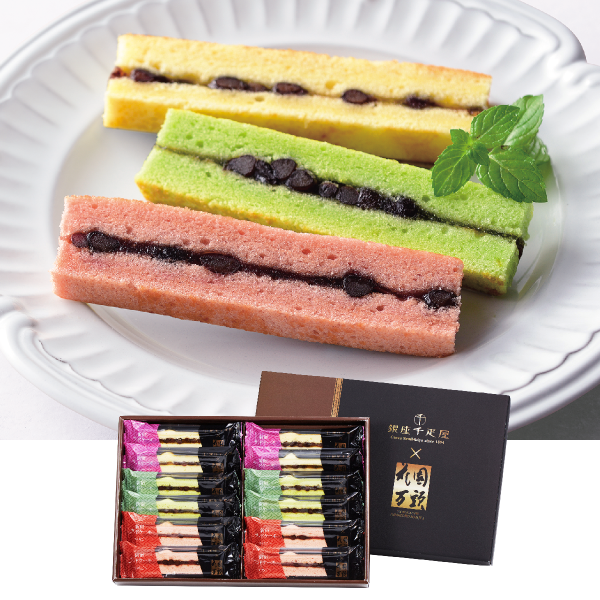 濃縮果汁を使用した[銀座千疋屋]のスポンジ生地に、フルーツジャムと[花園万頭]の銘菓「ぬれ甘なつと」をサンドした和洋折衷スイーツです。